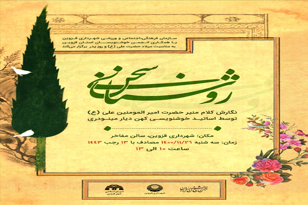 گفتنی است،نگارش کلام منیر حضرت امیرالمومنین علی (ع ) توسط سازمان فرهنگی،اجتماعی و ورزشی شهرداری قزوین با همکاری انجمن خوشنویسان استان قزوین به مناسبت میلاد حضرت علی (ع) و روز پدر برگزار می شود.