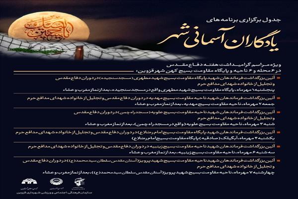 یه مناسبت بزرگداشت هفته دفاع مقدس؛«آئین بزرگداشت فرماندهان شهید در دوران دفاع مقدس و تجلیل از خانواده شهدای مدافع حرم» با عنوان یادگاران آسمانی شهر در قزوین برگزار می شود.