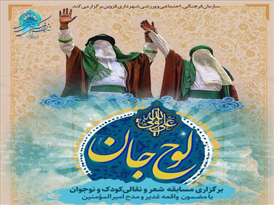 به گزارش روابط عمومی سازمان فرهنگی،اجتماعی و ورزشی شهرداری قزوین؛ مسابقه «لوح جان» با مضمون واقعه غدير و مدح امیرالمومنین(ع) در راستای انتقال پیام اهل بیت (ع)، آشنایی با سیره حضرت علی (ع)، نده نگه داشتن معارف ولایت علوی و واقعه غدیر خم در اذهان مردم به ویژه نسل جوان برگزار می شود.