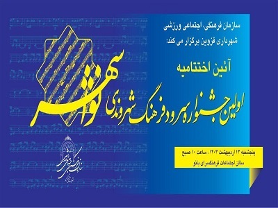 آئین اختتامیه اولین جشنواره سرود فرهنگ شهروندی "نواشهر " توسط سازمان فرهنگی اجتماعی ورزشی شهرداری قزوین برگزار می شود.