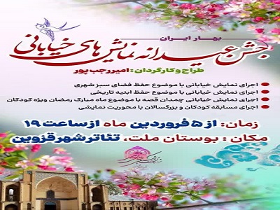 به گزارش روابط عمومی سازمان فرهنگی، اجتماعی و ورزشی شهرداری قزوین، به مناسبت سال نو جشن عیدانه نمایش های خیابانی توسط سازمان فرهنگی اجتماعی ورزشی شهرداری قزوین برگزار می شود. اجرای نمایش خیابانی با موضوع حفظ فضای سبز شهری اجرای نمایش خیابانی با موضوع حفظ ابنیه تاریخی اجرای نمایش خیابانی چمدان قصه با موضوع ماه مبارک رمضان ویژه کودکان اجرای مسابقه کودکان و بزرگسالان با محوریت نمایشی