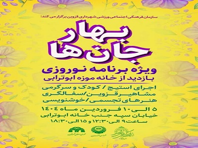 ویژه برنامه بهار جان ها با اجرای برنامههای متنوع "استیج،کودک و سرگرمی،مشاهیر قزوین،سفالگری هنرهای تجسمی و خوشنویسی توسط سازمان فرهنگی اجتماعی ورزشی شهرداری قزوین برگزار می شود.