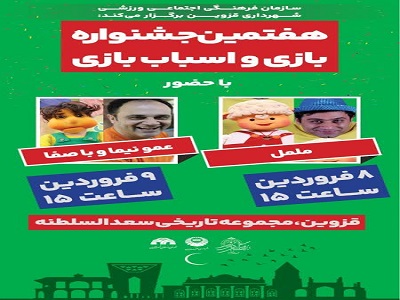 به گزارش روابط عمومی سازمان فرهنگی، اجتماعی و ورزشی شهرداری قزوین؛ هفتمین جشنواره بازی و اسباب بازی با حضور ململ ،عمو نیما و با صفا برگزار می شود.
