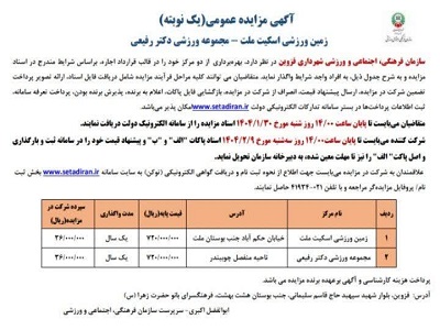 آگهی مزایده عمومی(یک نوبته )زمین ورزشی اسکیت ملت _خیابان حکم آباد جنب بوستان ملت مجموعه ورزشی دکتر رفیعی _ناحیه منفصل چوبیندر