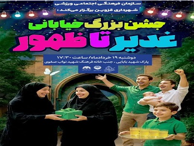 به مناسبت اعیاد باسعادت قربان و غدیر جشن بزرگ خیابانی غدیر تا ظهور با اجرای برنامههای متنوع در بوستان شهید بابایی جنب خانه فرهنگ شهید نواب صفوی توسط سازمان فرهنگی اجتماعی ورزشی شهرداری قزوین برگزار می شود.