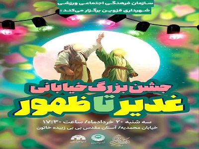 به مناسبت اعیاد باسعادت قربان ،غدیر جشن بزرگ خیابانی غدیر تا ظهور توسط سازمان فرهنگی اجتماعی ورزشی شهرداری قزوین برگزار میشود.