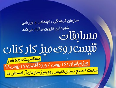 به مناسبت دهه مبارک فجر؛مسابقه تنیس روی میز کارکنان شهرداری ویژه بانوان توسط سازمان فرهنگی، اجتماعی و ورزشی شهرداری در در سالن تنیس سازمان آرمستان های شهرداری قزوین برگزار شد.