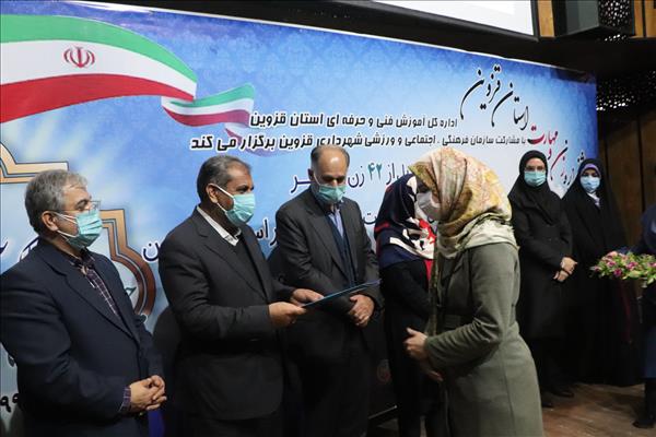 این گزارش می افزاید؛در این مراسم از ۴۲ زن ماهر برگزیده استان قزوین با اهدای لوح و جوایز تجلیل شد،در حاشیه این جشنواره، نمایشگاه محصولات بانوان ماهر استان قزوین در نگارخانه سازمان فرهنگی،اجتماعی و ورزشی شهرداری قزوین در معرض نمایش گذاشته شده بود.