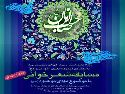 به مناسبت میلاد با سعادت امام زمان (عج) مسابقه شعر خوانی با موضوع مهدی موعود (عج) توسط سازمان فرهنگی،اجتماعی و ورزشی شهرداری قزوین برگزار می شود.