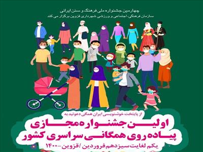 اولین جشنواره مجازی پیاده روی همگانی سراسری توسط سازمان فرهنگی،اجتماعی و ورزشی شهرداری قزوین به مناسبت "چهارمین جشنواره ملی فرهنگ و سنن ایرانی" برگزار می شود.
