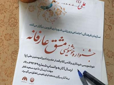 به گزارش روابط عمومی سازمان فرهنگی،اجتماعی و ورزشی شهرداری قزوین؛ جشنواره خوشنویسی "مشق عارفانه"  با موضوع کلام قصار حضرت امیرالمومنین علی(ع) در دو رشته خوشنویسی تحریری (خودکاری) و قلمی برگزار می شود.