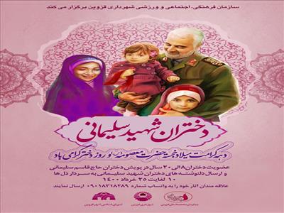 به مناسبت دهه کرامت، میلاد خجسته حضرت معصومه (س) و روز دختر؛پویش دختران حاج قاسم سلیمانی توسط سازمان فرهنگی،اجتماعی و ورزشی شهرداری قزوین برگزار می شود.