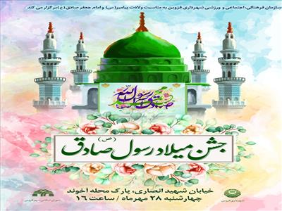 به گزارش روابط عمومی سازمان فرهنگی،اجتماعی و ورزشی شهرداری قزوین؛جشن میلاد «رسول صادق» امروز، چهارشنبه 28 مهرماه سالجاری ساعت 16 در بوستان محله آخوند واقع در خیابان شهید انصاری برگزار می شود.